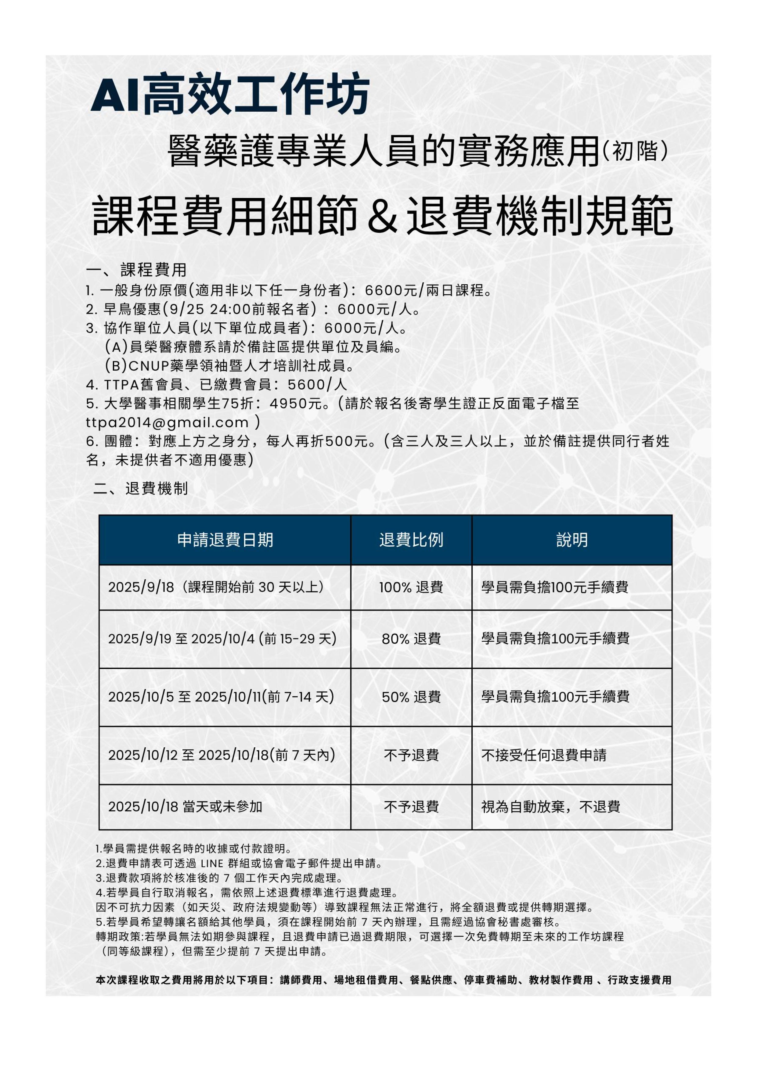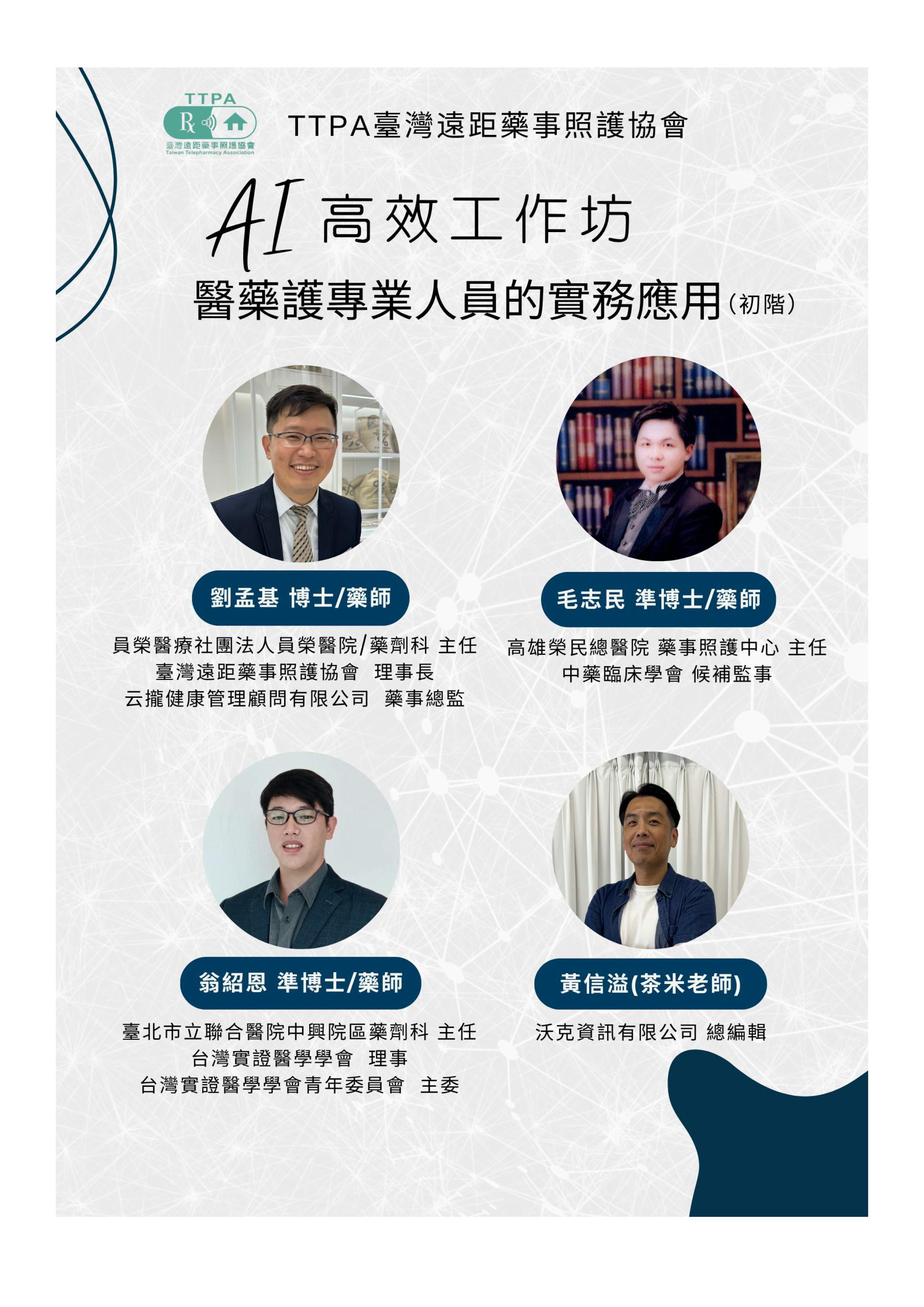 轉知,臺灣遠距藥事照護協會辦理「AI高效工作坊:醫藥護專業人員的實務應用」課程,請參閱。課程資訊