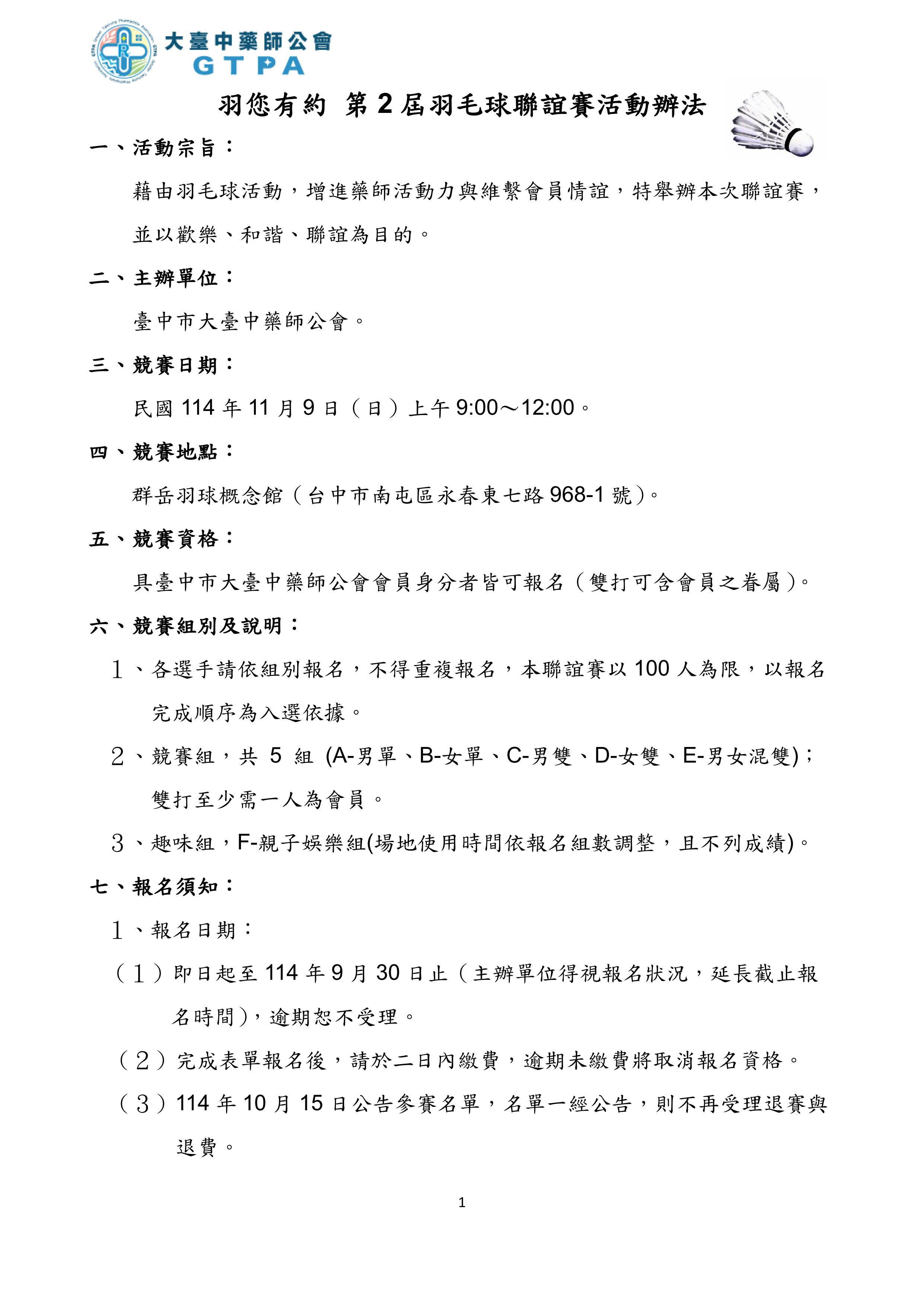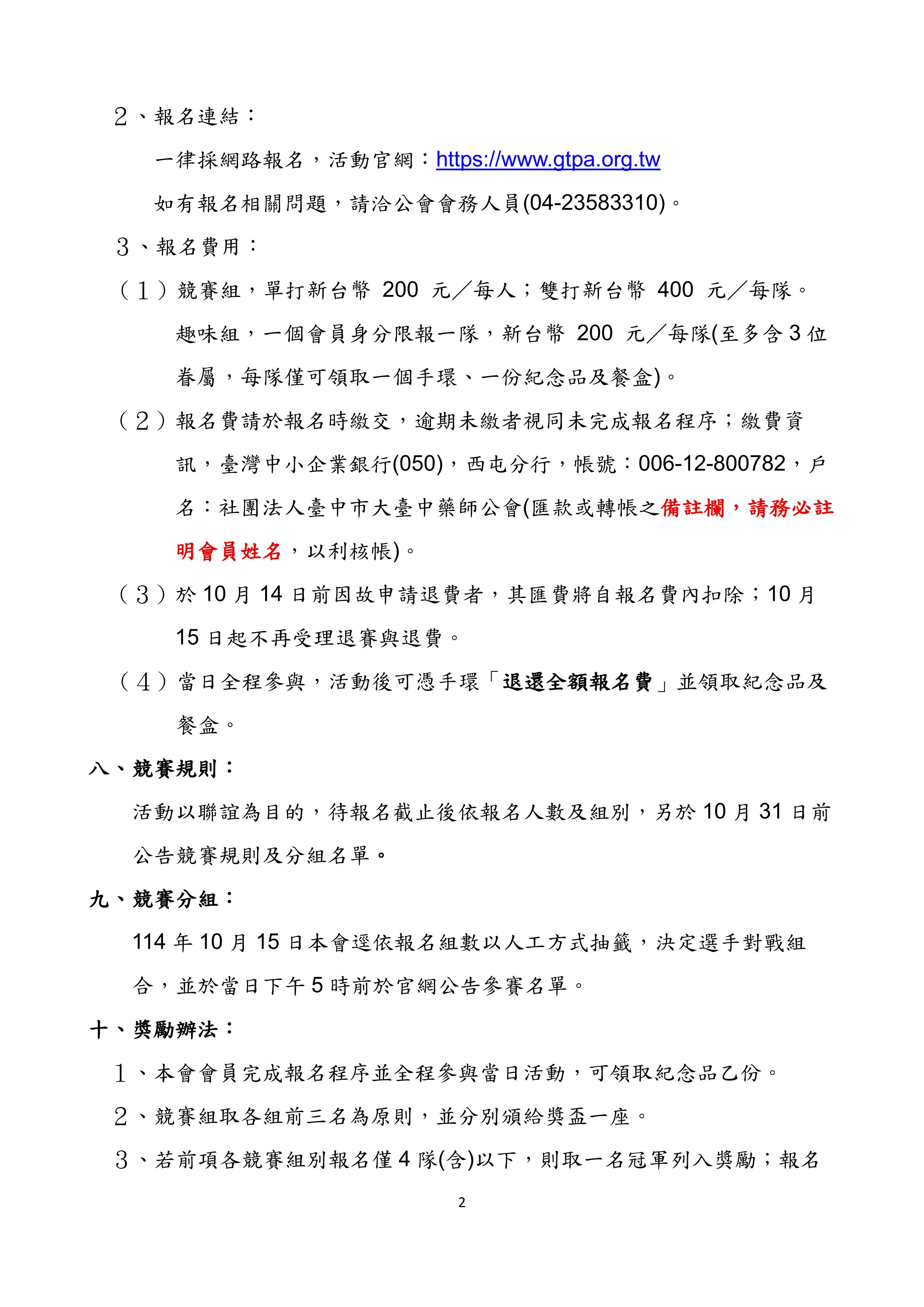 挑戰強度較高、跑跳激烈,裁判吹判,歡迎報名競賽組;只想輕鬆開打、以球會友,自行計分,歡迎報名趣味組。若有問題請電洽公會 04-23583310。