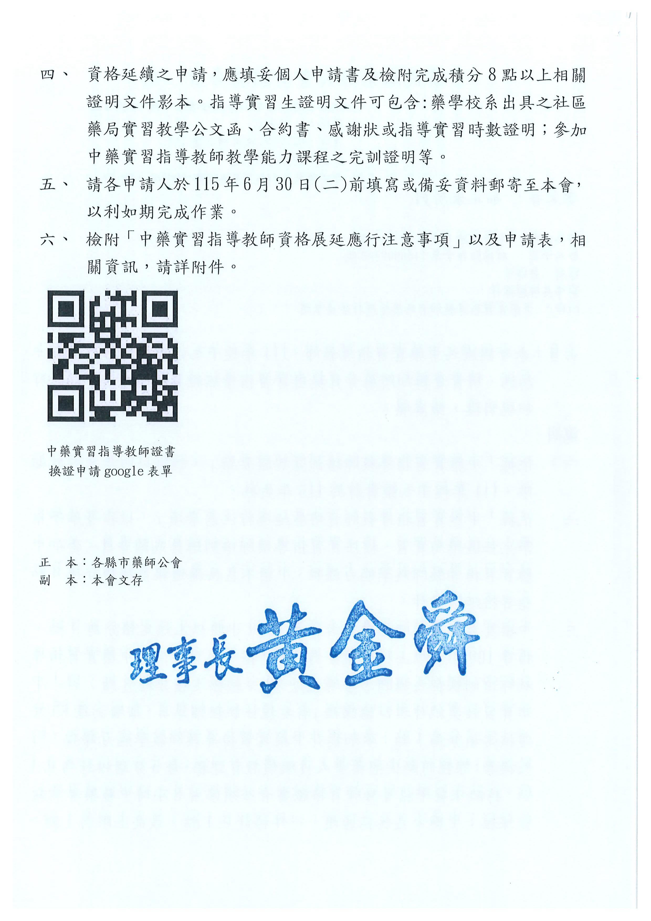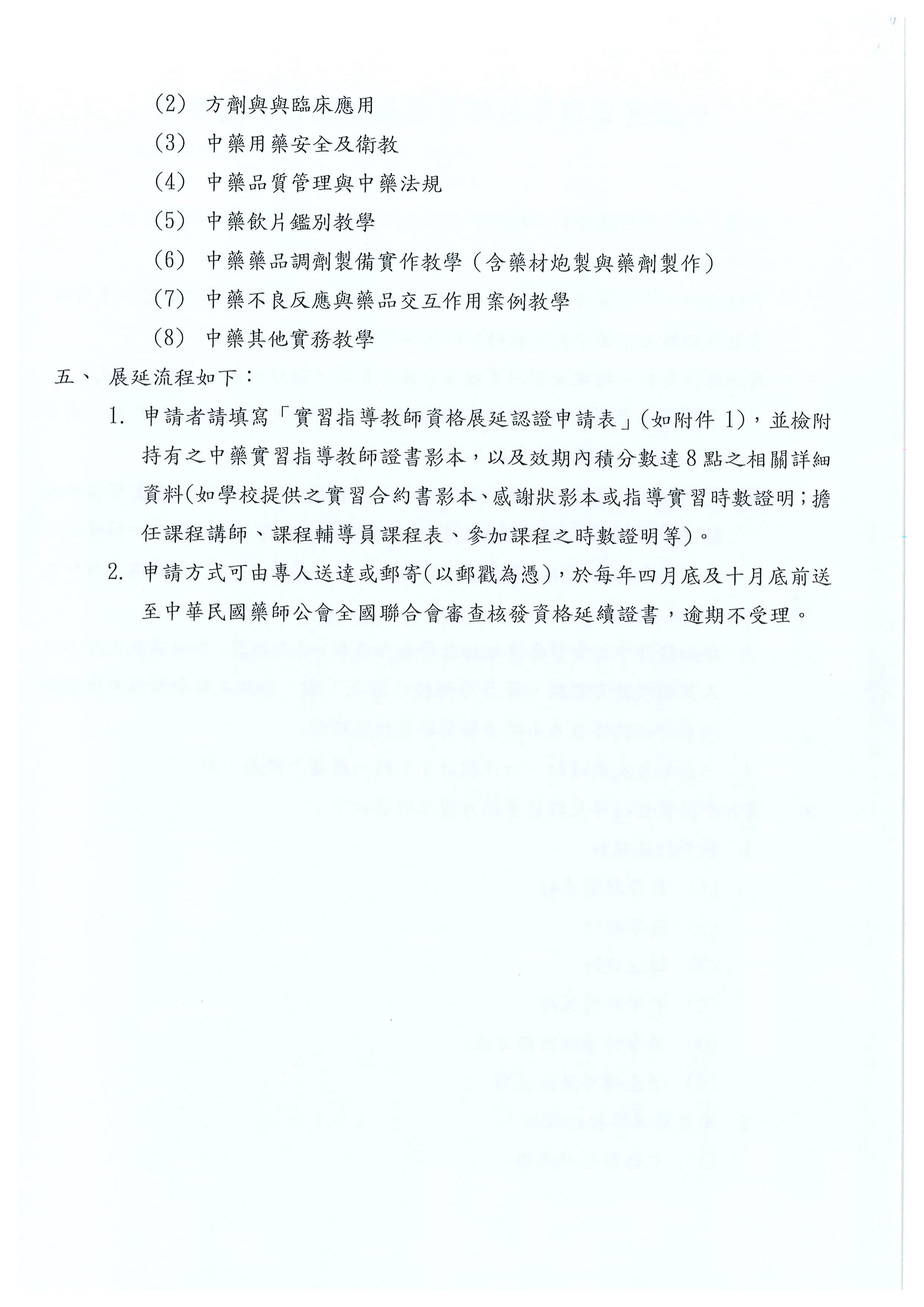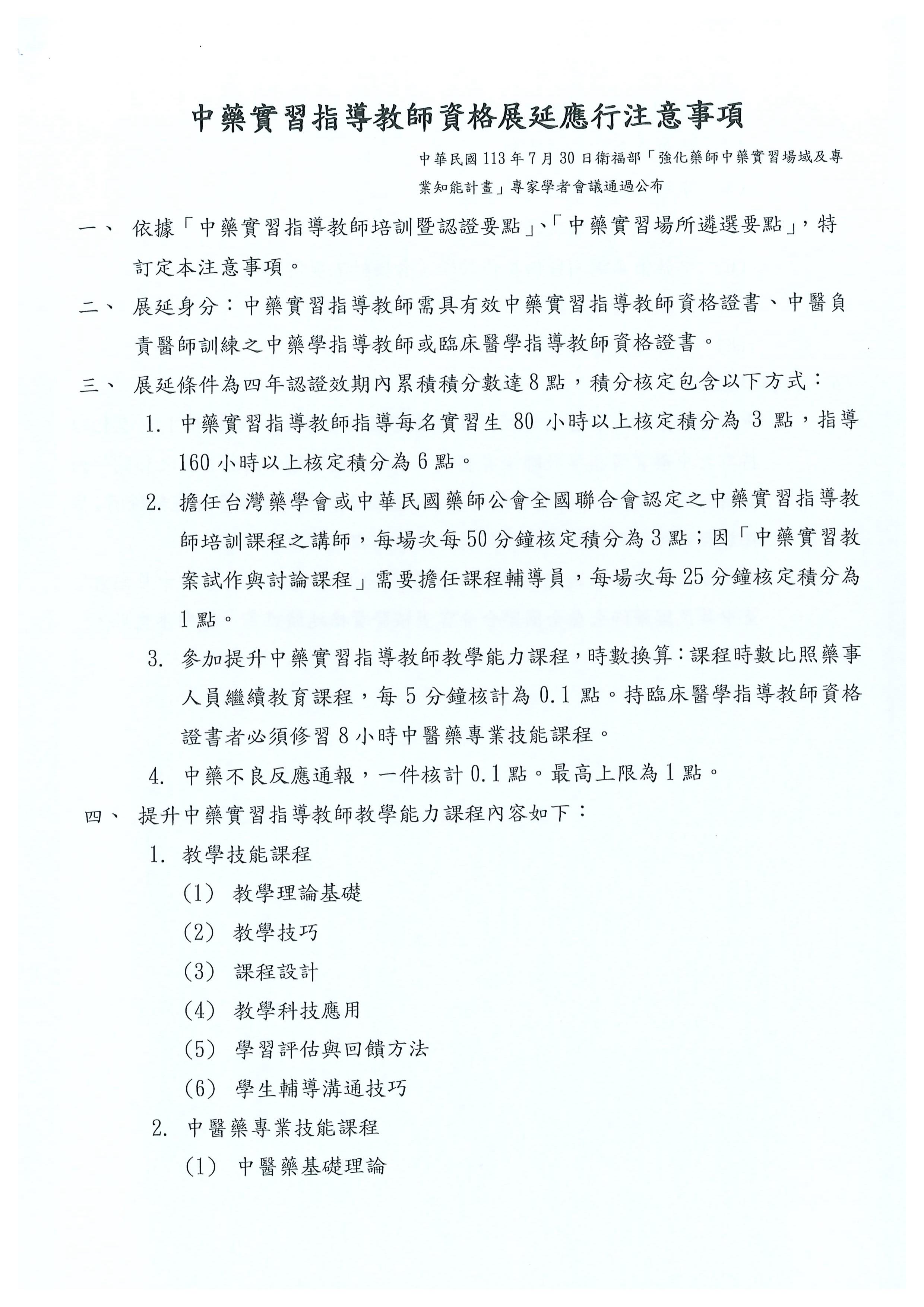 轉知,全聯會認證之中藥實習指導教師資格延續之申請,請詳閱。