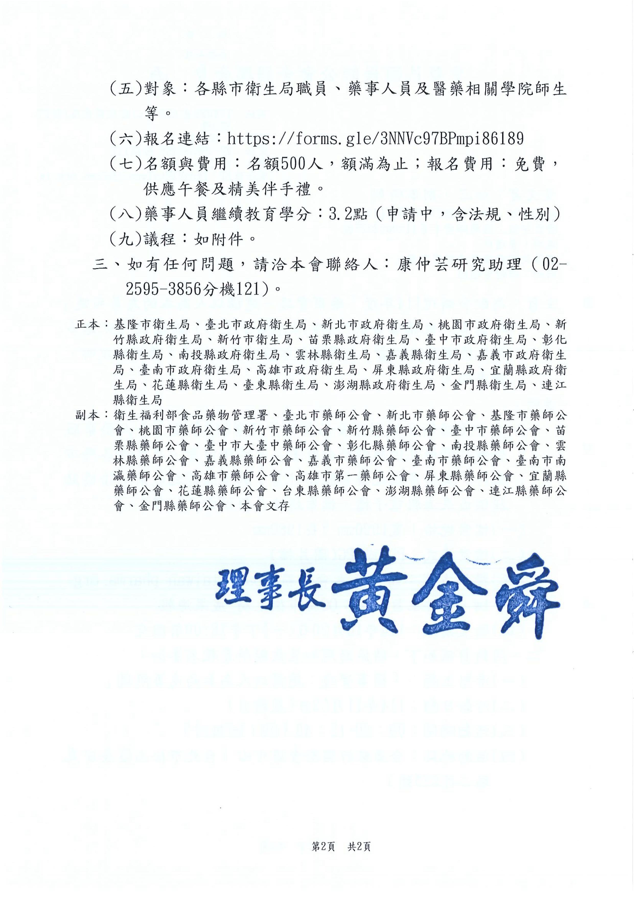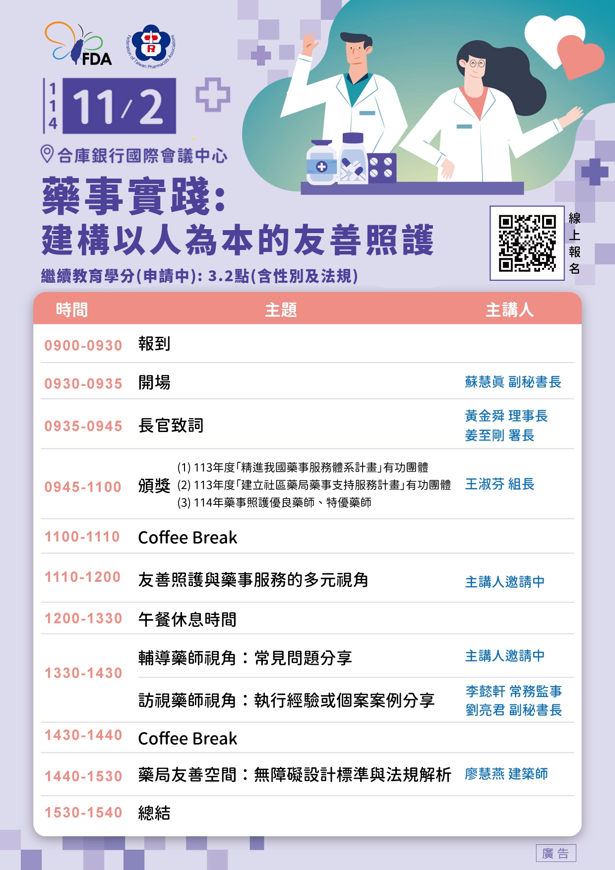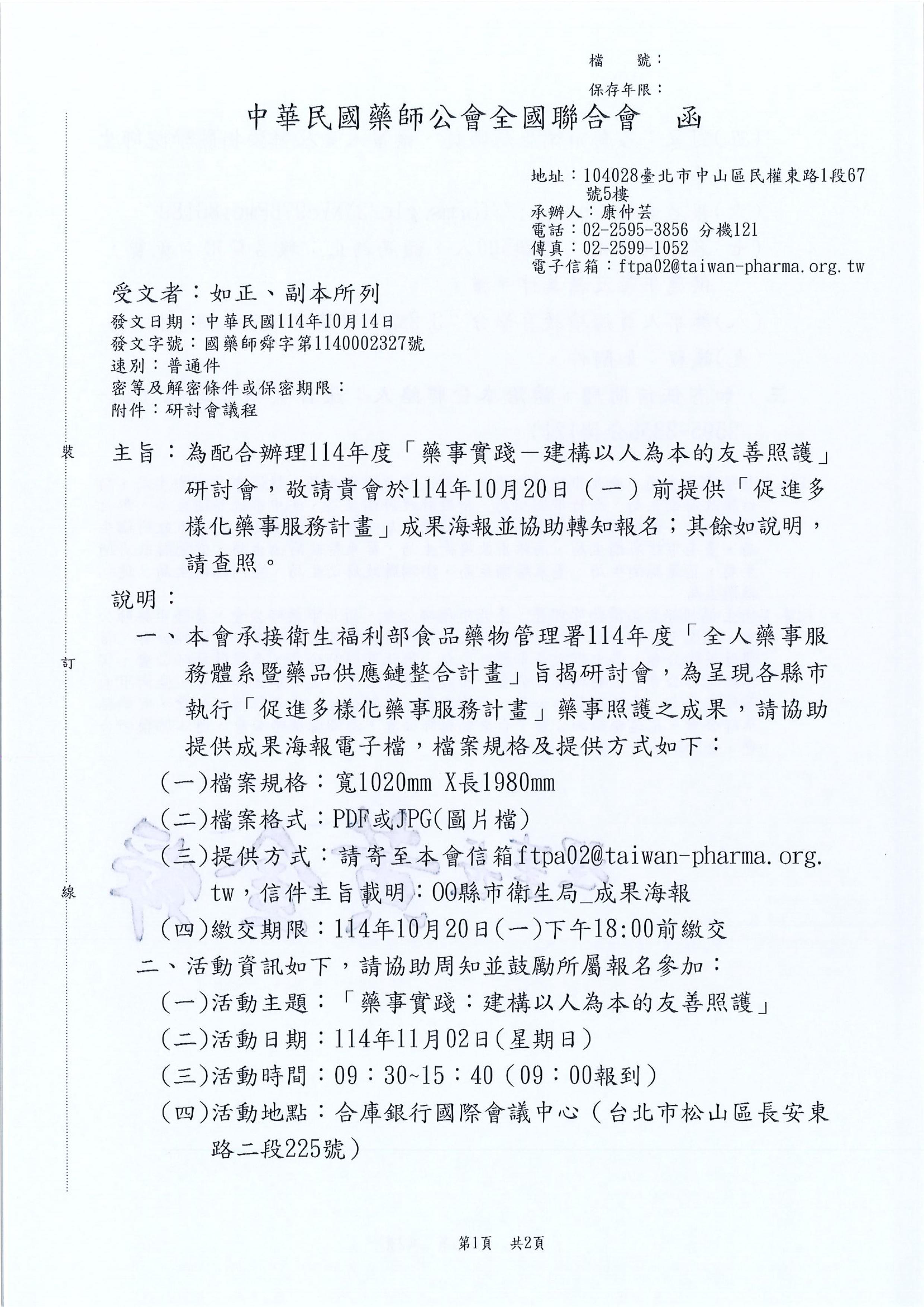 轉知,全聯會114年度「藥事實踐-建構以人為本的友善照護」研討會報名資訊,請參閱。