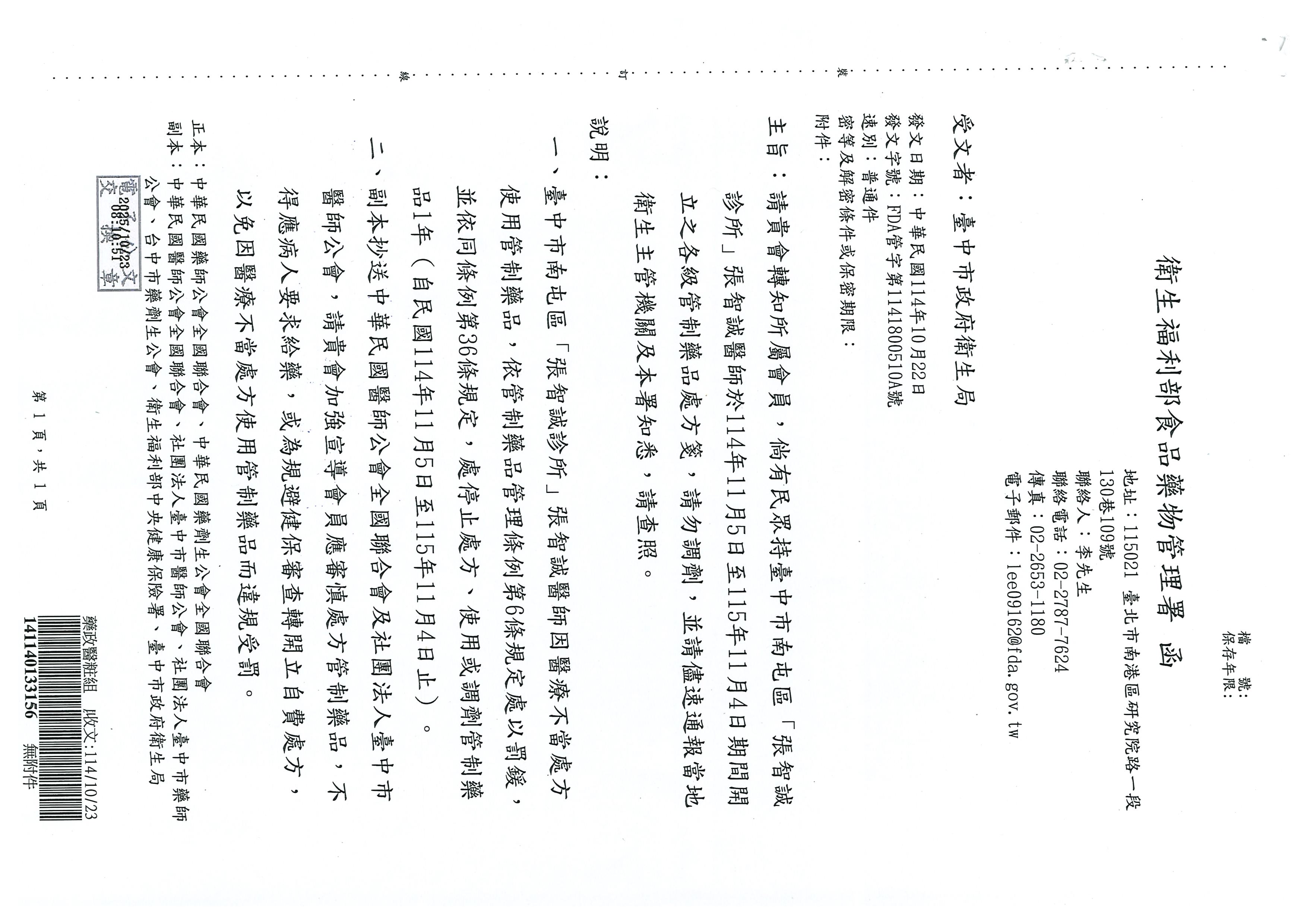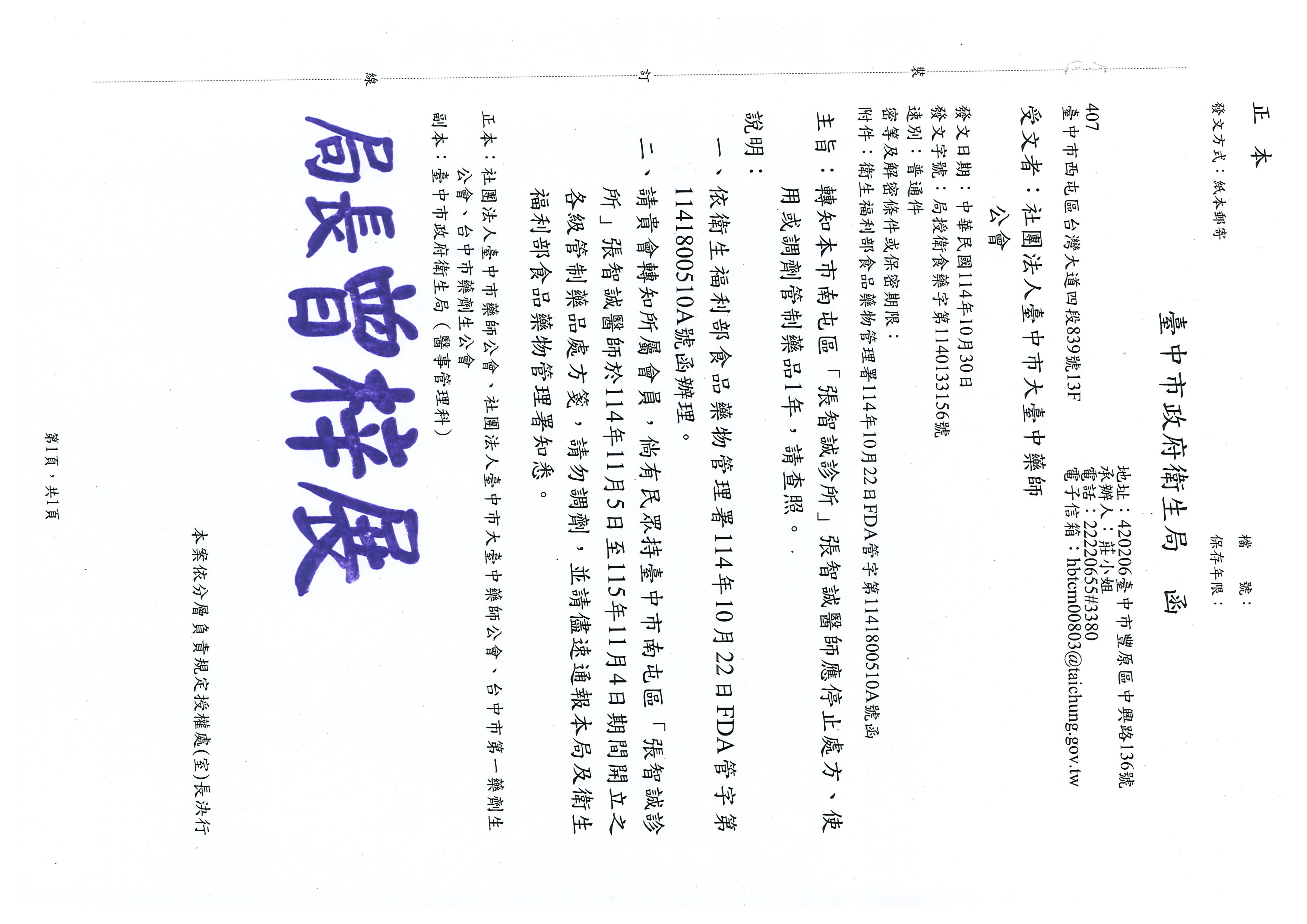 轉知,本市南屯區「張智誠診所」張智...