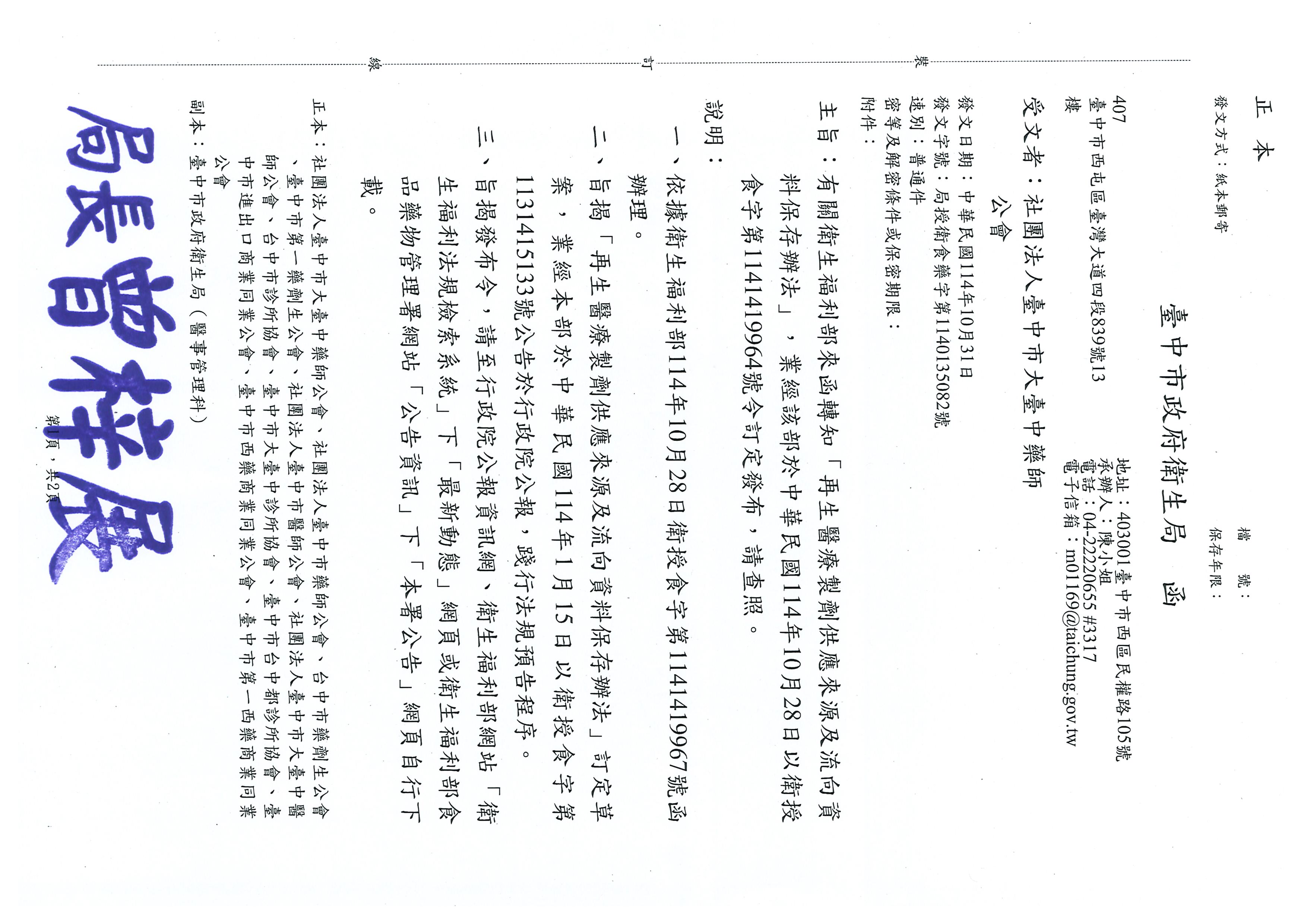 轉知,有關衛生福利部來函「再生醫療製劑供應來源及流向資料保存辦法」,業經該部於中華民國114/10/28以衛授食字第1141419964號令訂定發布,請參閱。