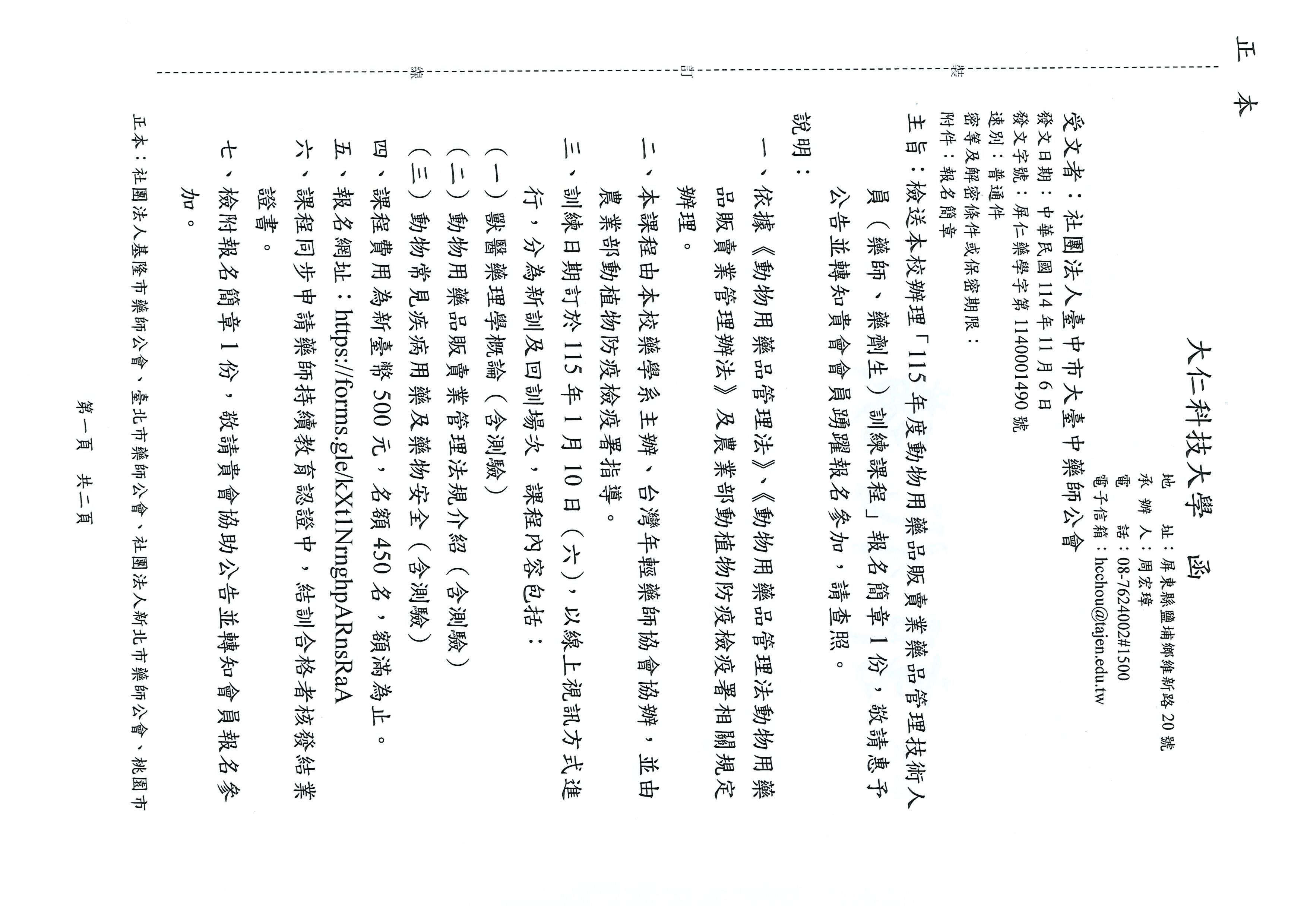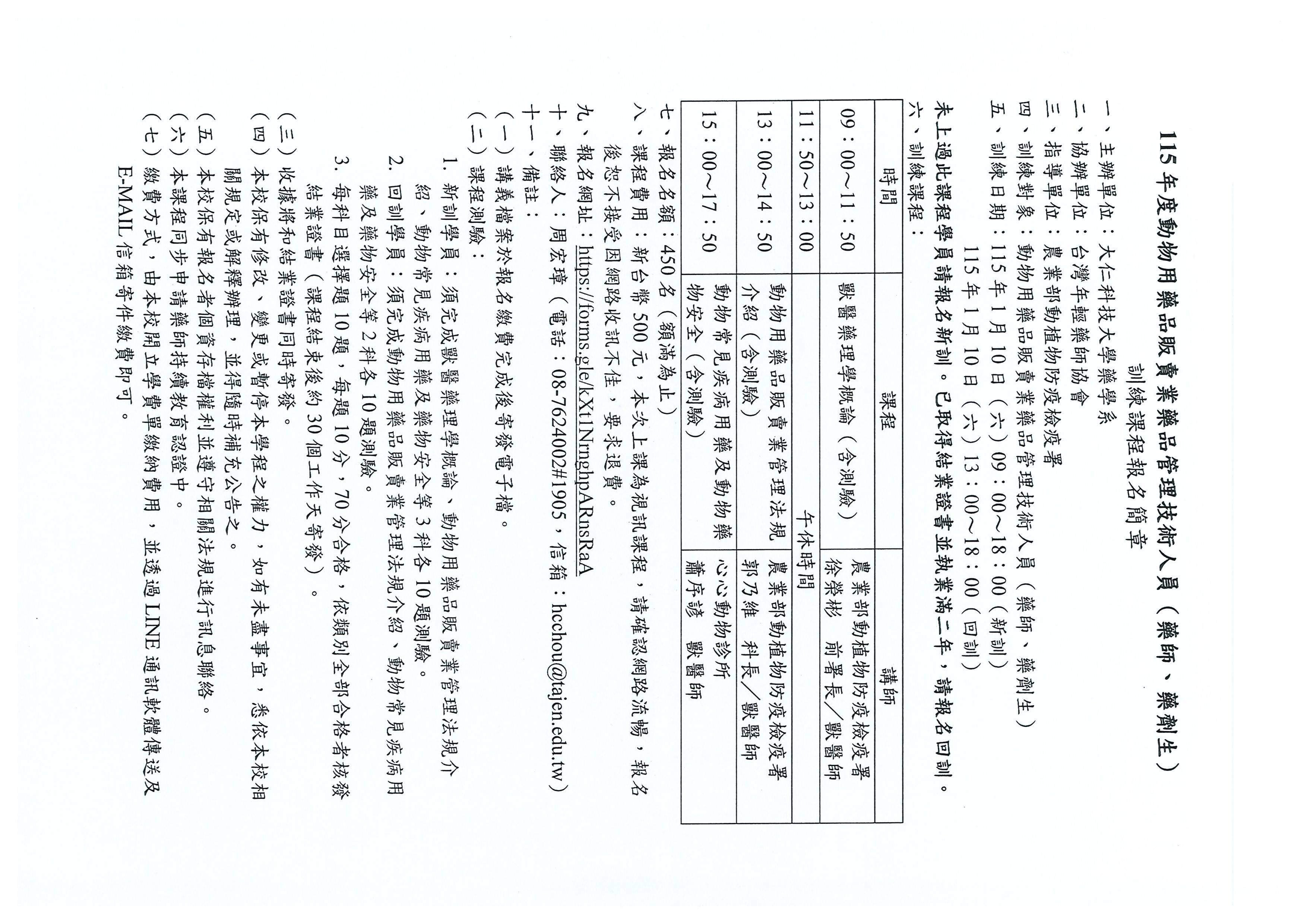 轉知,大仁科技大學辦理「115年度動物用藥品販賣藥品管理技術人員(藥師、藥劑生)訓練課程」報名簡章1份,請參閱。