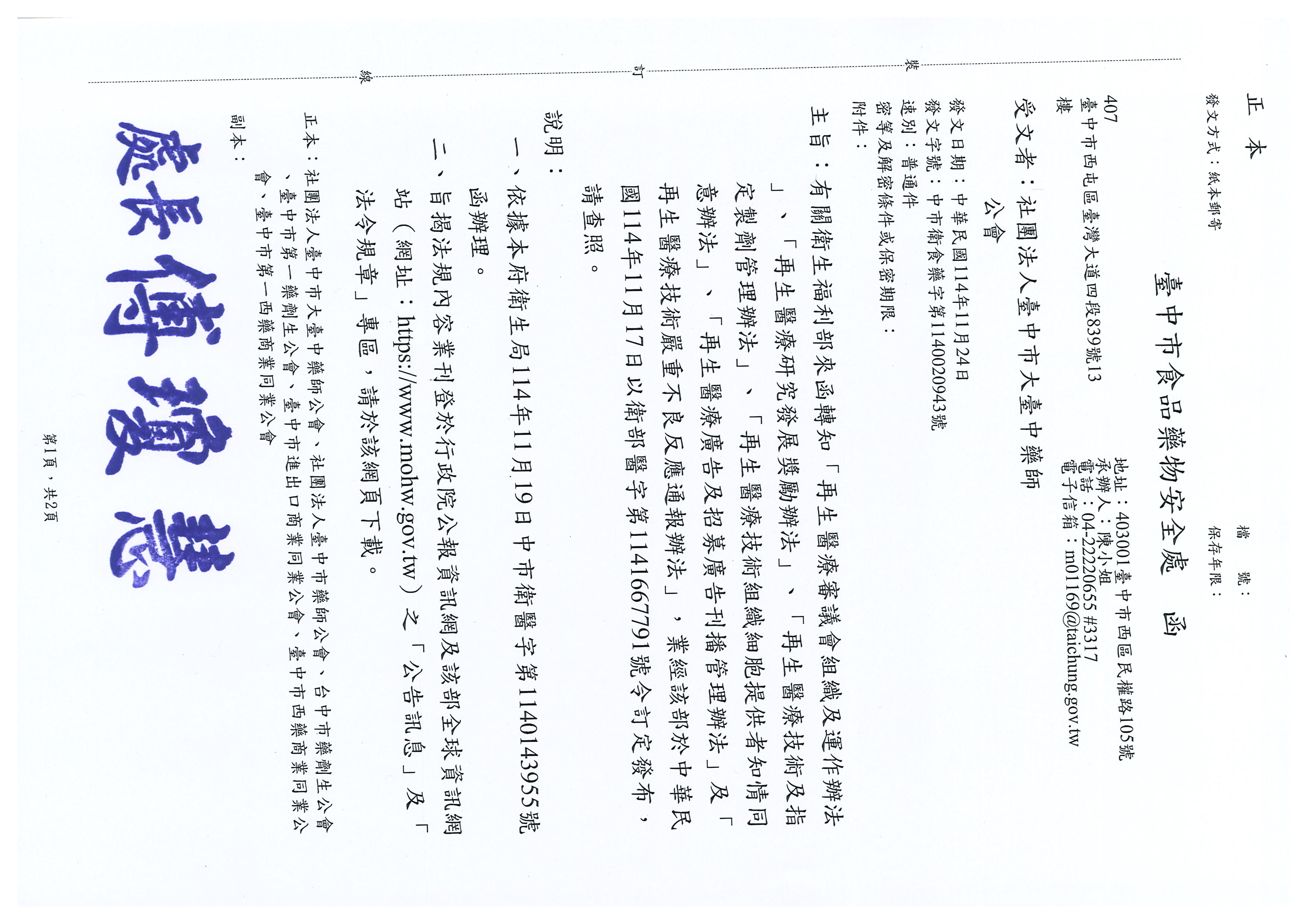 轉知,有關衛生福利部來函轉知「再生醫療審議會組織及運作辦法」、「再生醫療研究發展獎勵辦法」、「再生醫療技術及指定製劑管理辦法」、「再生醫療廣告及招募廣告刊研究發展獎勵辦法」及「再生醫療技術嚴重不良反應通報辦法」,業經該部於中華民國114年11月17日以衛部醫字第1141667791號令訂定發布,請參閱。