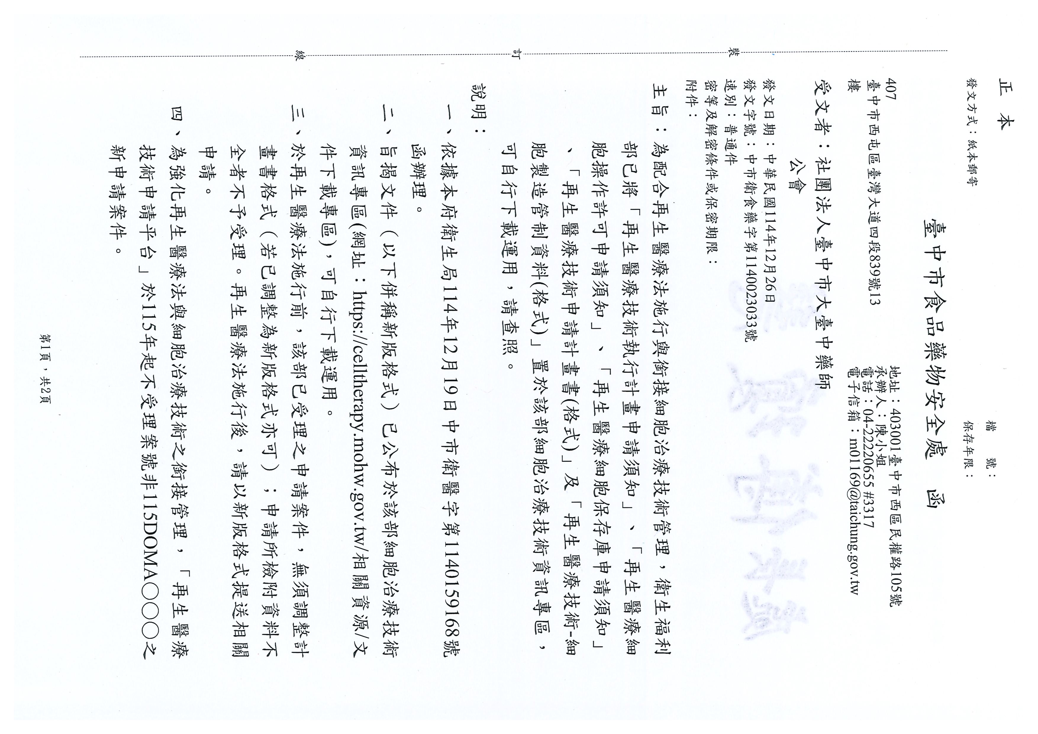 轉知,為配合再生醫療法施行與銜接細胞治療技術管理,衛生福利部已將「再生醫療技術執行計畫申請須知」、「再生醫療細胞操作許可申請須知」、「再生醫療細胞保存庫申請須知」、「再生醫療技術申請計畫書(格式)」及「再生醫療技術-細胞製造管制資料(格式)」置於該部細胞治療技術資訊專區,可自行下載運用,請參閱。