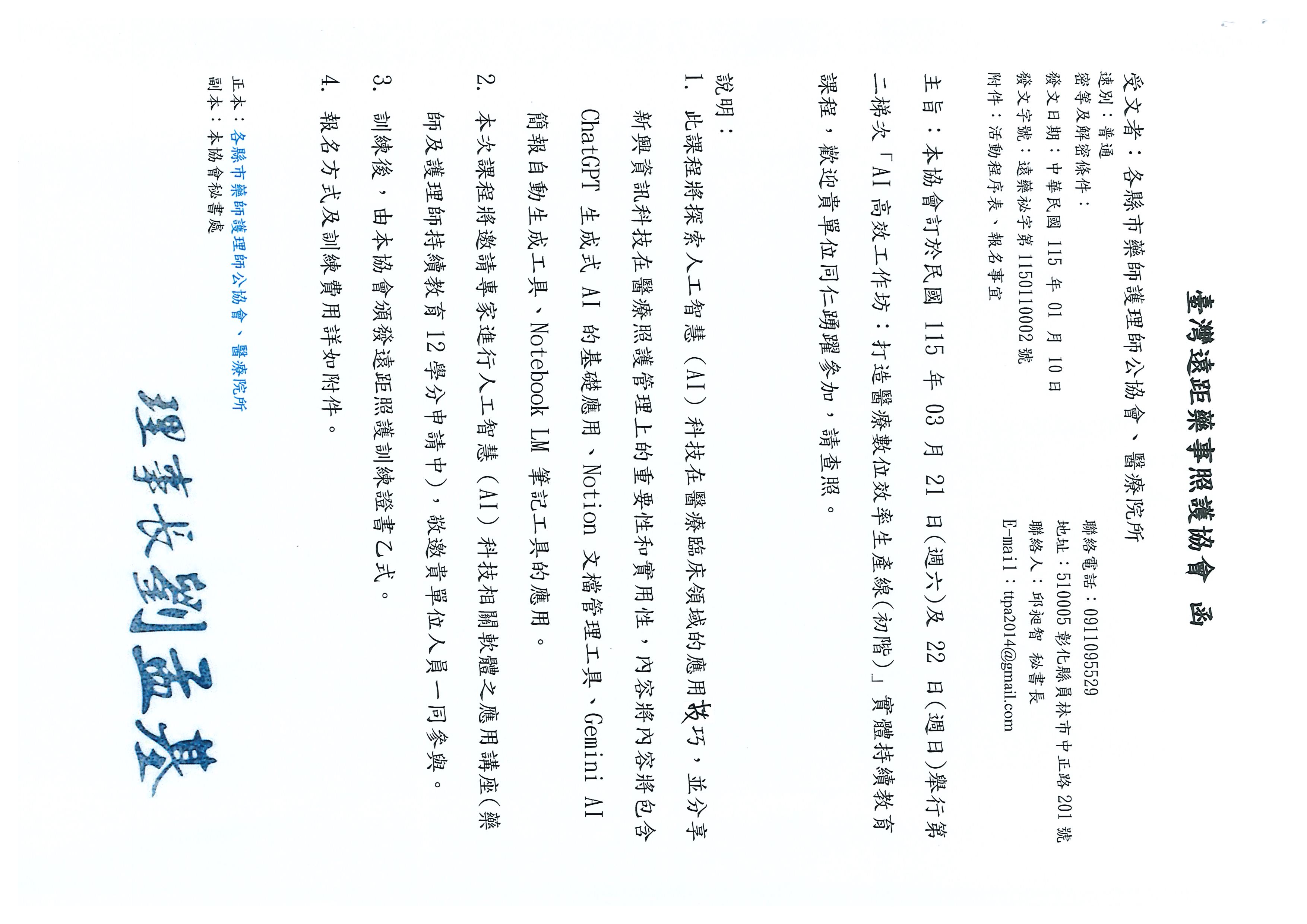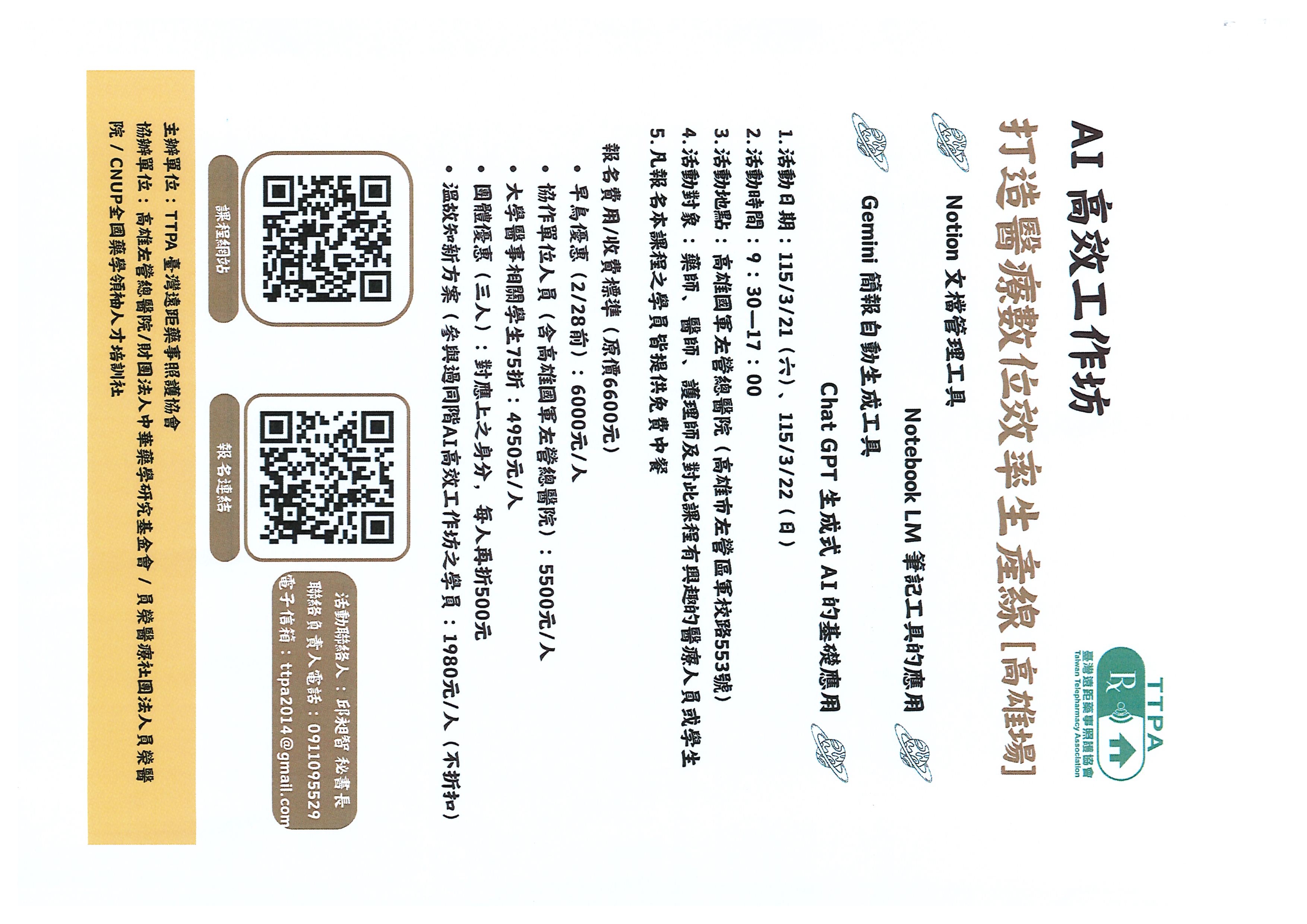 轉知,臺灣遠距藥事照護協會於115年3月21日(週六)及22日(週日)舉行第二梯次「AI高效工作坊:打造醫療數位效率生產線(初階)」實體持續教育課程,請參閱。