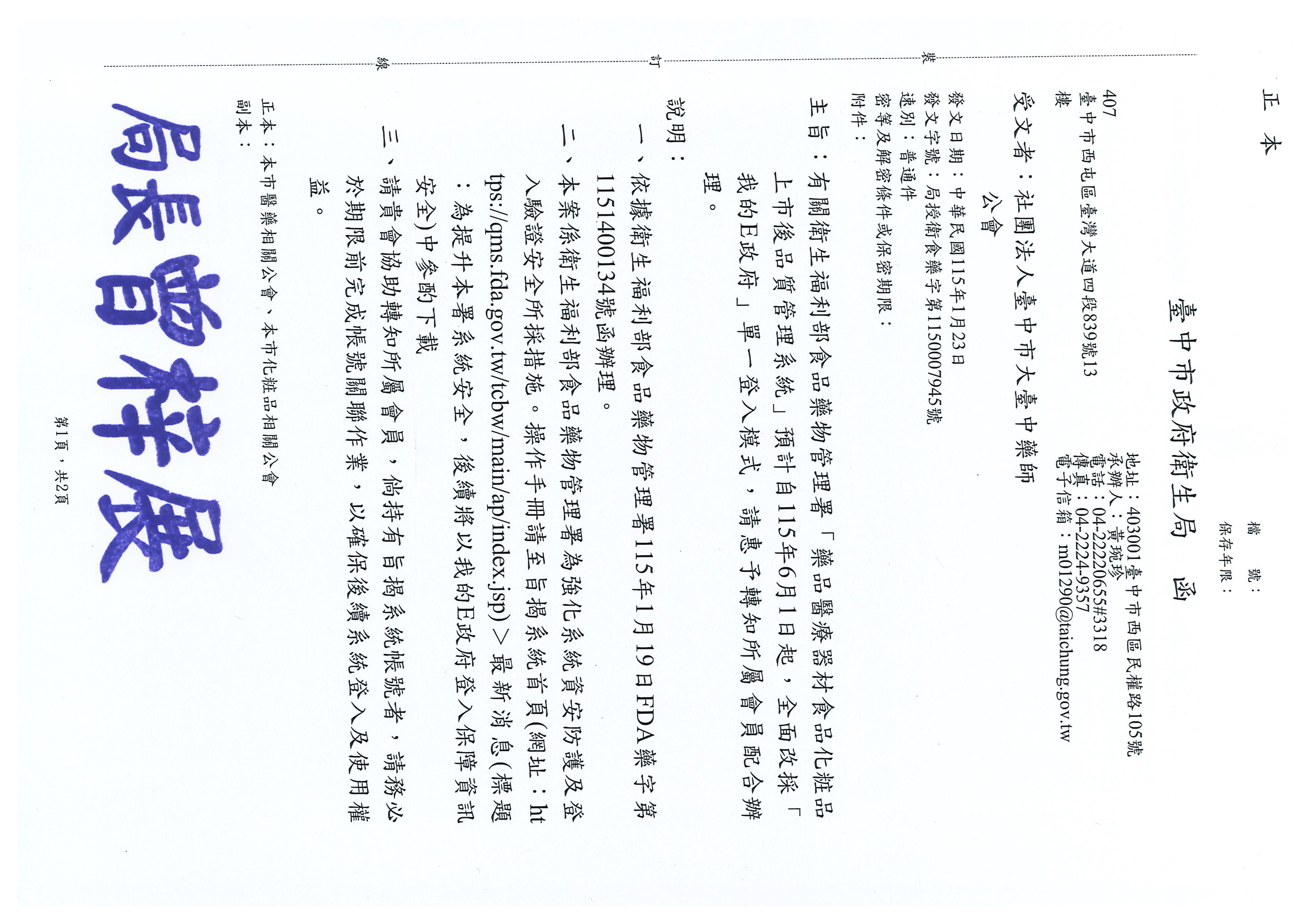 轉知,有關衛生福利部食品藥物管理署「藥品醫療器材食品化粧品上市後品質管理系統」預計自115/6/1起,全面改採「我的E政府」單一登入模式,請參閱。