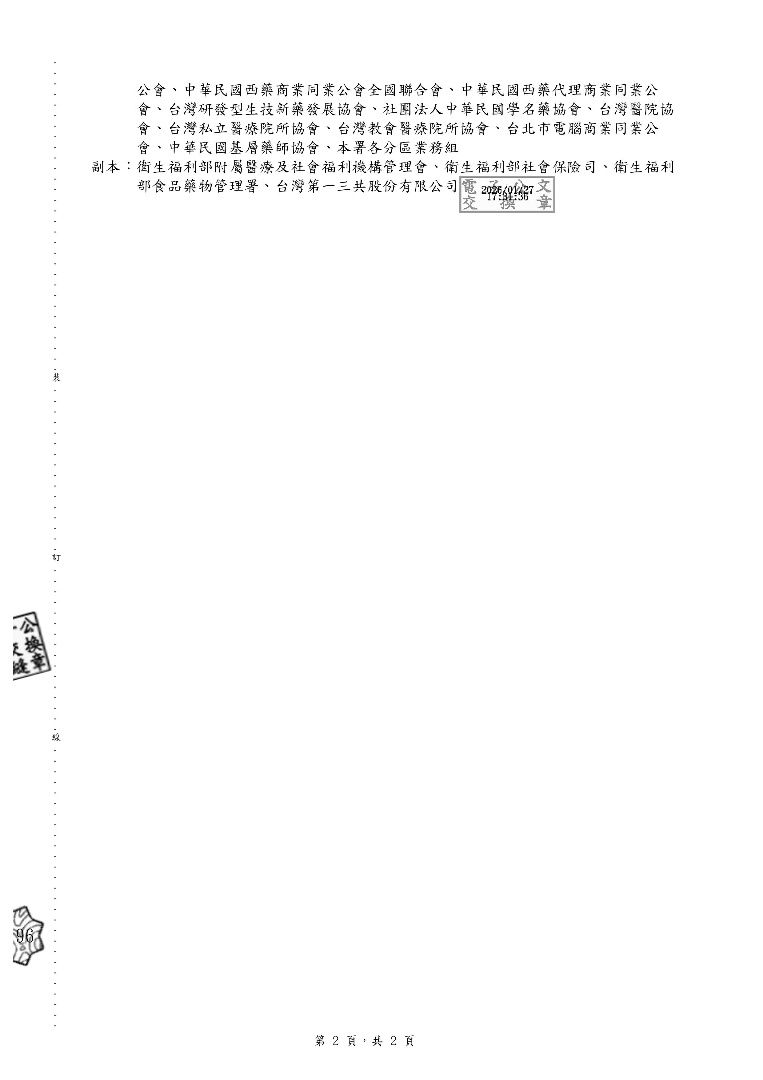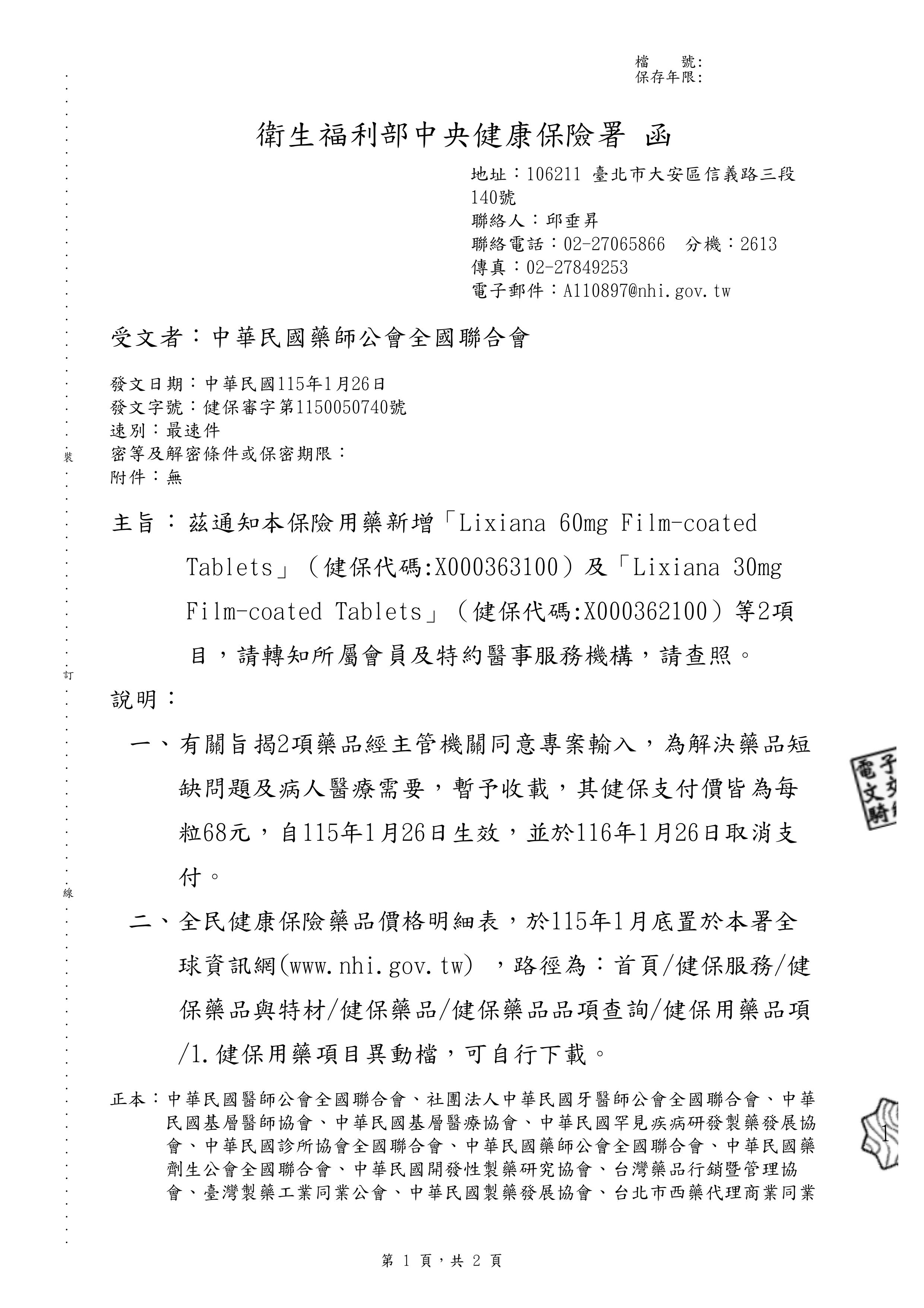 轉知,全民健康保險用藥新增「Lixiana 60mg Film-coated Tablets」(健保代碼:X000363100)及「Lixiana 30mg Film-coated Tablets」(健保代碼:X000362100)等2項目,請參閱。