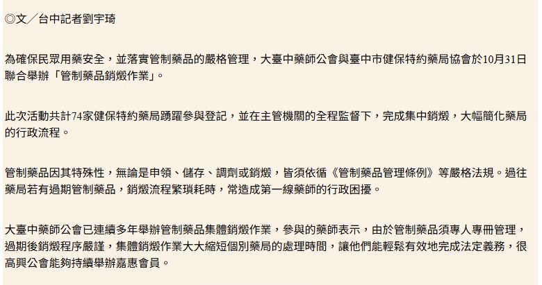 ↑大臺中藥師公會與臺中市健保特約藥局協會於10月31日聯合舉辦「管制藥品銷燬作業」。