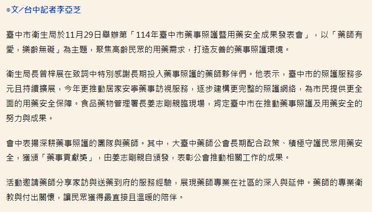 ↑ 臺中市衛生局於11月29日舉辦第「114年臺中市藥事照護暨用藥安全成果發表會」。