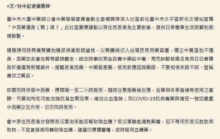 ↑ 臺中市大臺中藥師公會深入社區宣導「中西藥傷身(腎)嗎?」