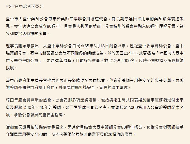 ↑大臺中藥師公會於藥師節舉辦會員聯誼餐會。